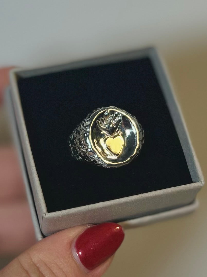 Sustainability and recycling is one of my main points when making jewellery so it was no question to take this special commission on. My gorgeous customer had a drawer full of sentimental gold and silver, ready to be recycled into this flaming heart signet ring! She brought the inspiration and we worked together on designing the initial ring which we also tweaked a couple of times to make sure it was exactly what she was after. This chunky signet is made of solid sterling silver with a Gold heart as the highlight of the piece.