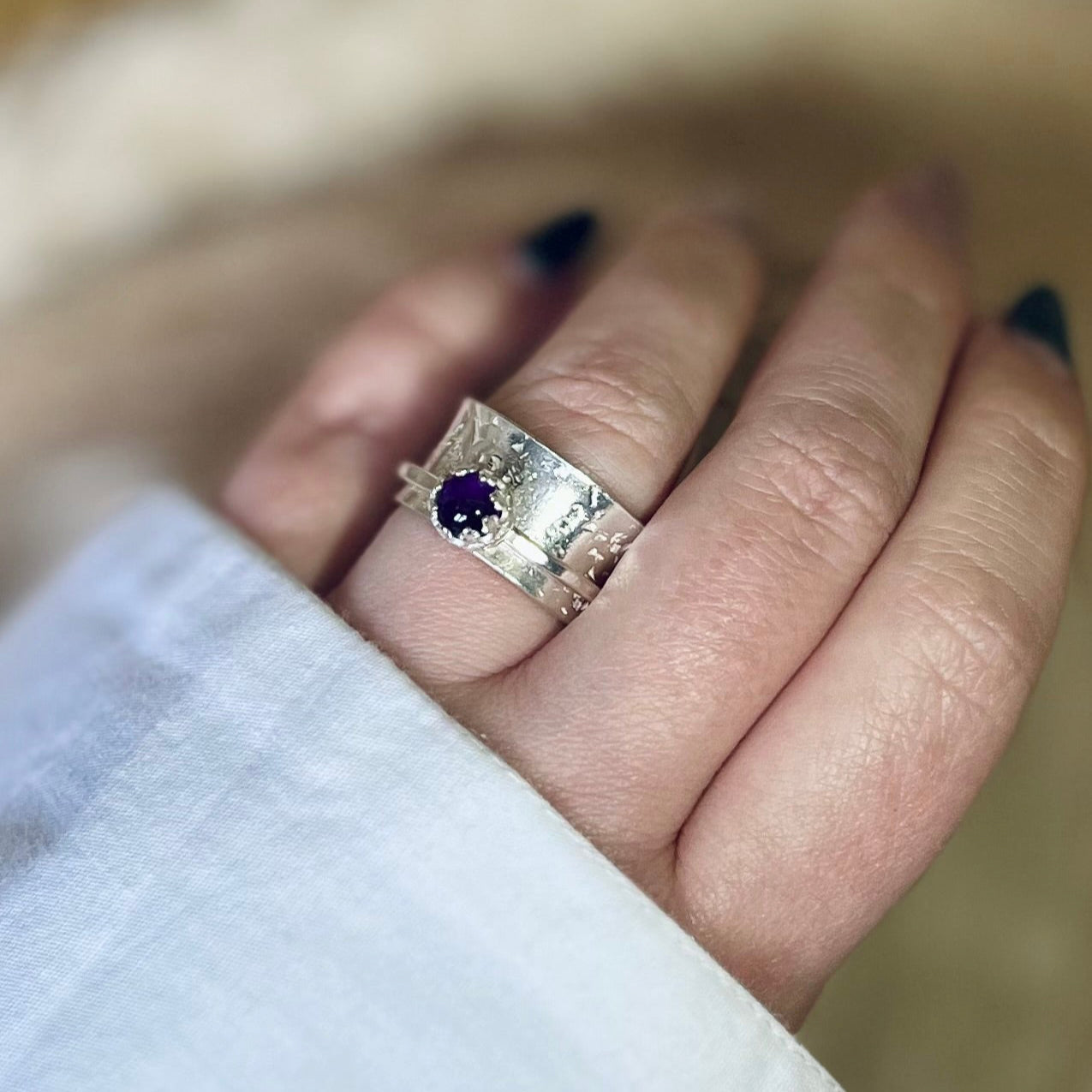 This fun and unique Sterling Silver Spinner Ring features a gorgeous amethyst stone that spins around a chunky, unique textured band.