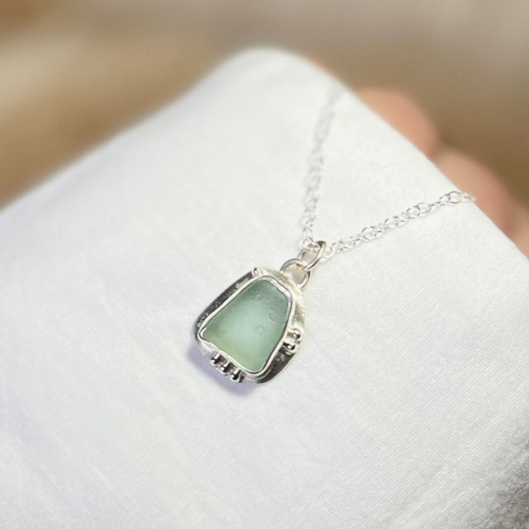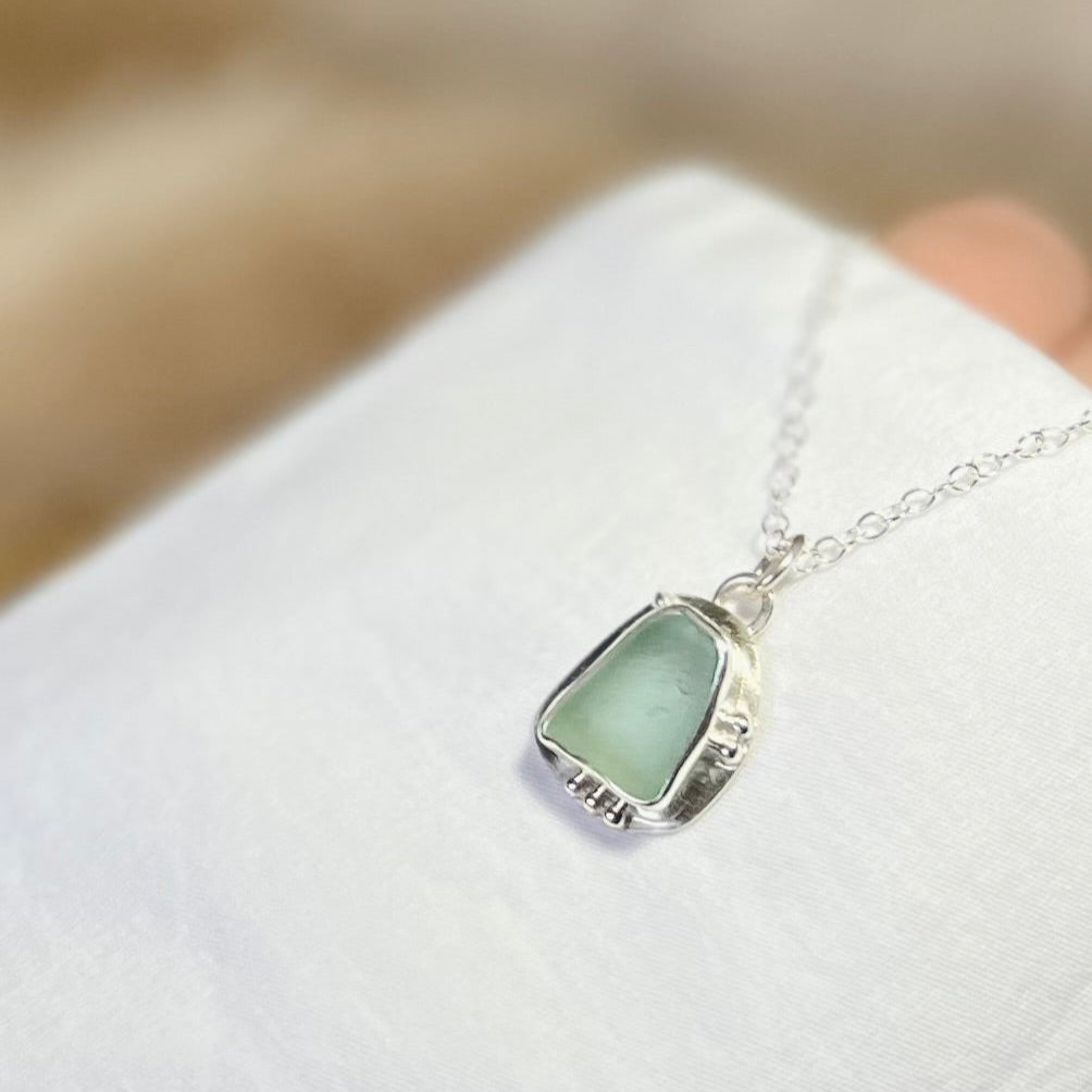 This one-of-a-kind necklace captures the serene beauty of Cornwall, with delicate blue Cornish seaglass set in recycled sterling silver. Collected by my family from the gorgeous Cornish coastline, the seaglass is left untreated and unshaped, preserving its natural form exactly as it was found.