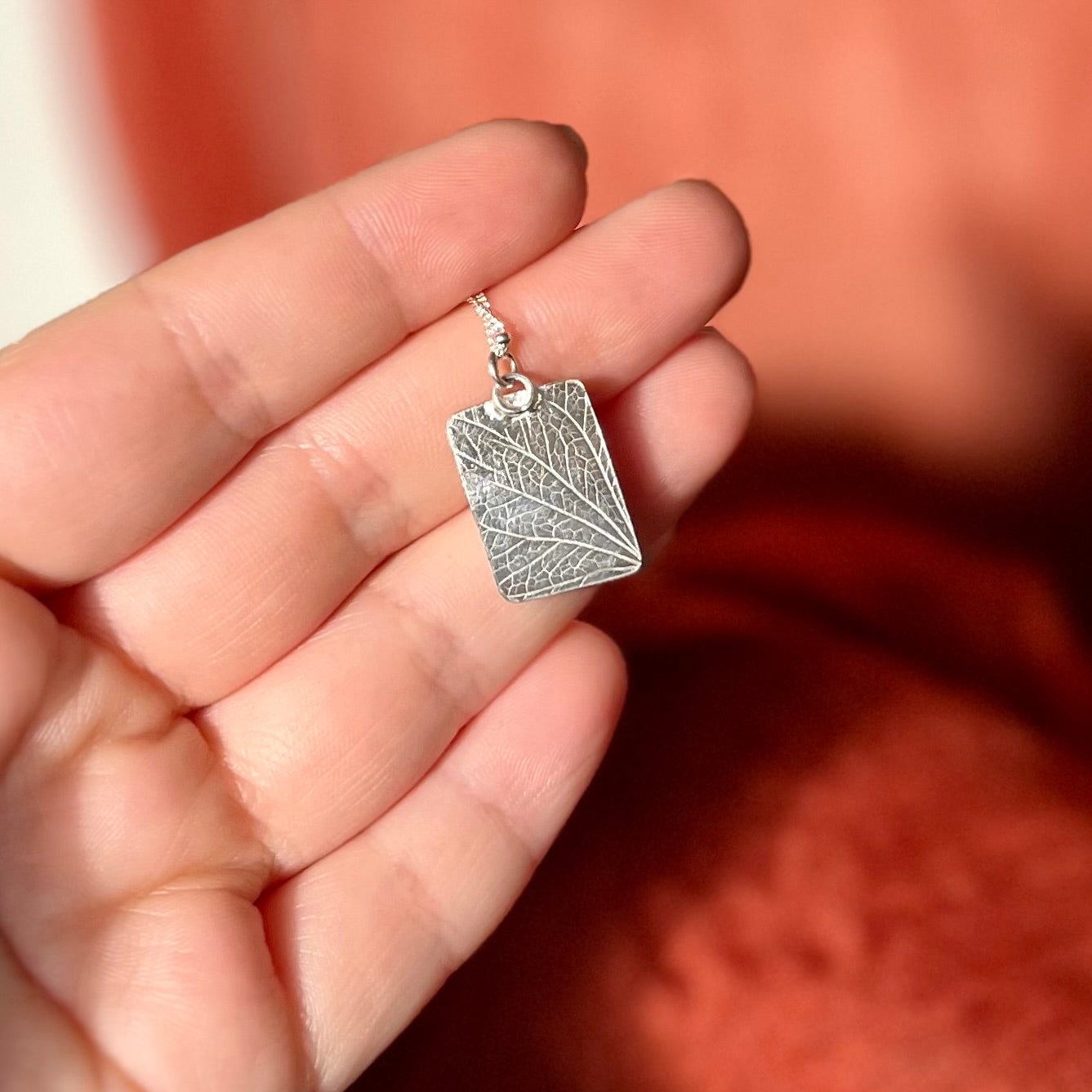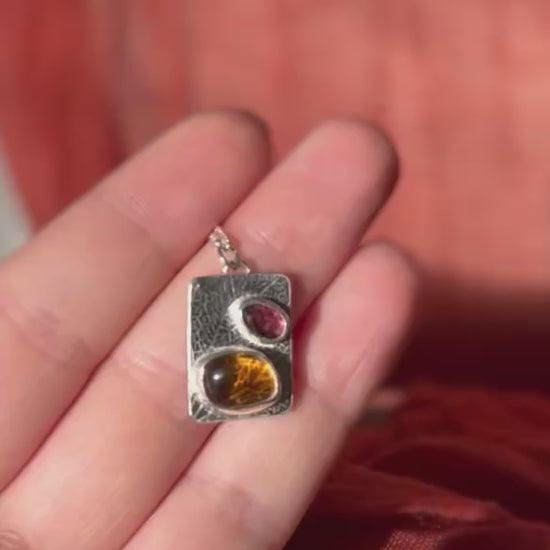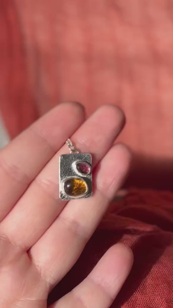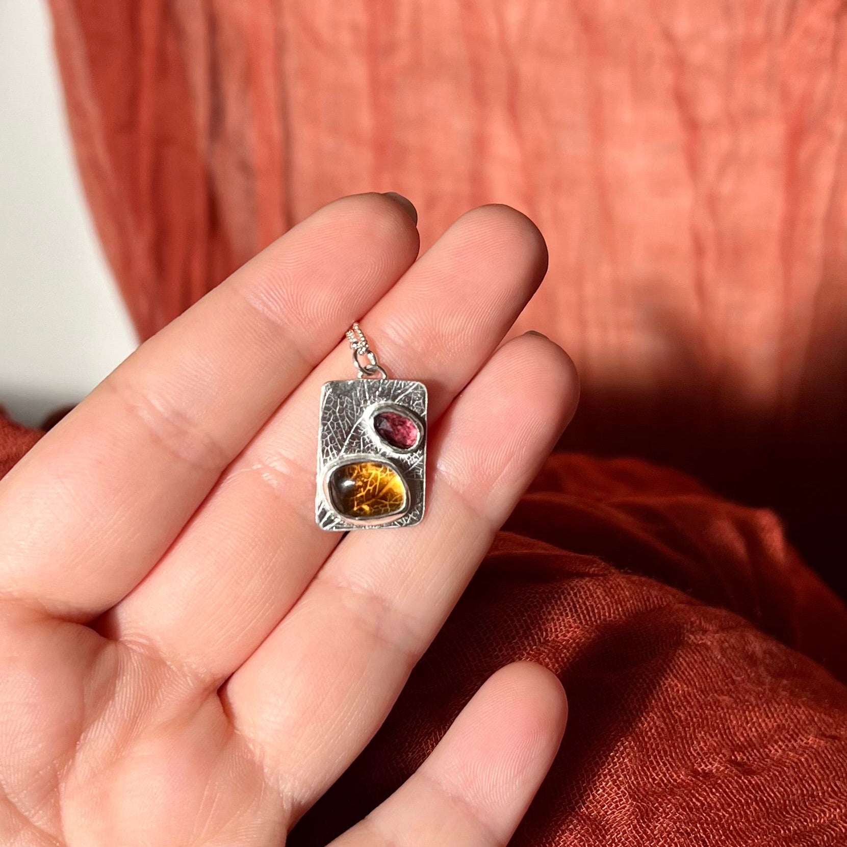 A delicate yet vibrant Sterling Silver necklace featuring Citrine and Pink Tourmaline gemstones set on a hand-cut silver sheet printed with a hydrangea flower petal design. The warm golden tones of Citrine and soft pink hues of Tourmaline blend together like a sunset, creating a luminous and playful piece.