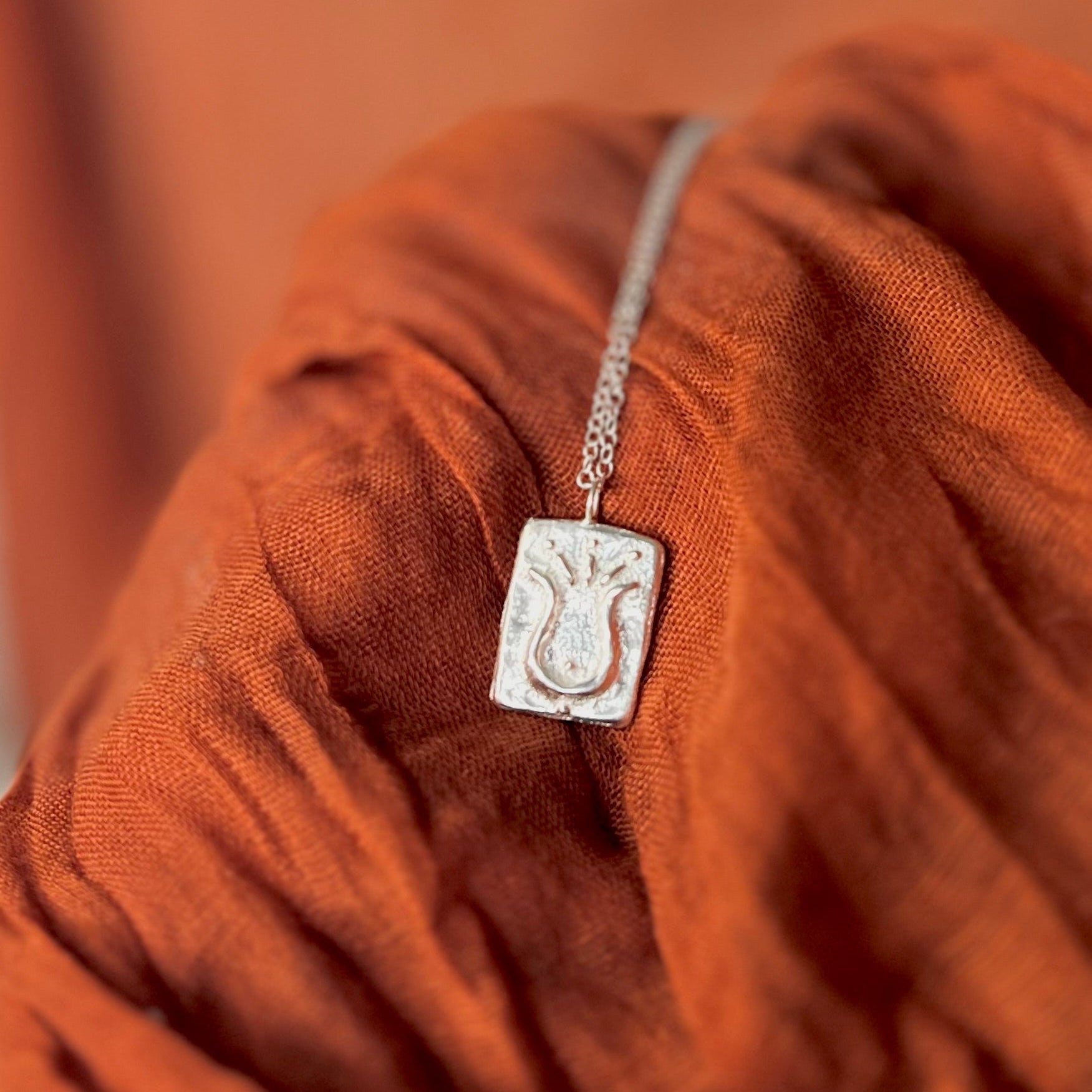 This pendant is handcrafted from solid recycled sterling silver using the ancient technique of sand casting. Each piece is individually shaped and textured by hand, giving it a tactile, weighty presence that celebrates artisanal skill.