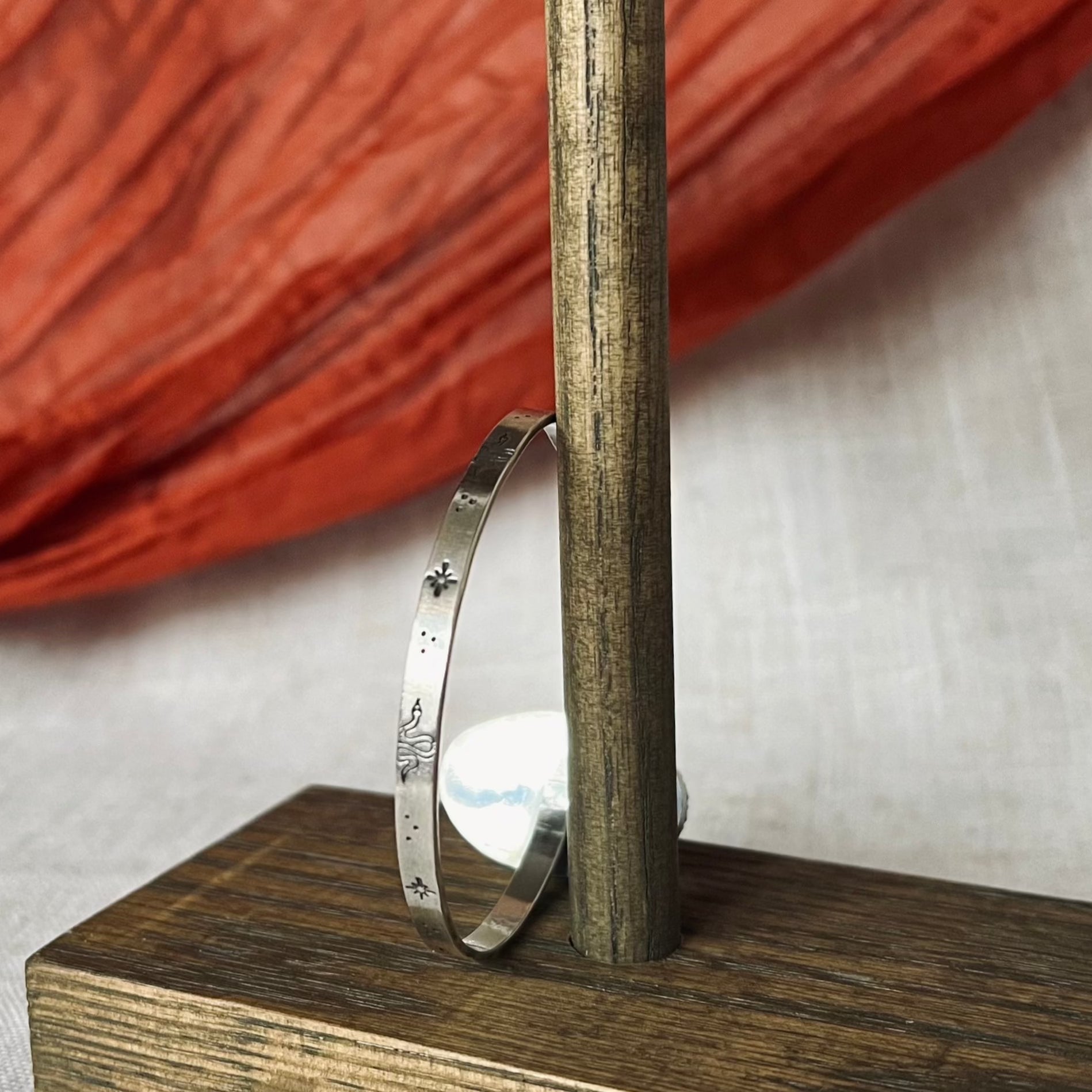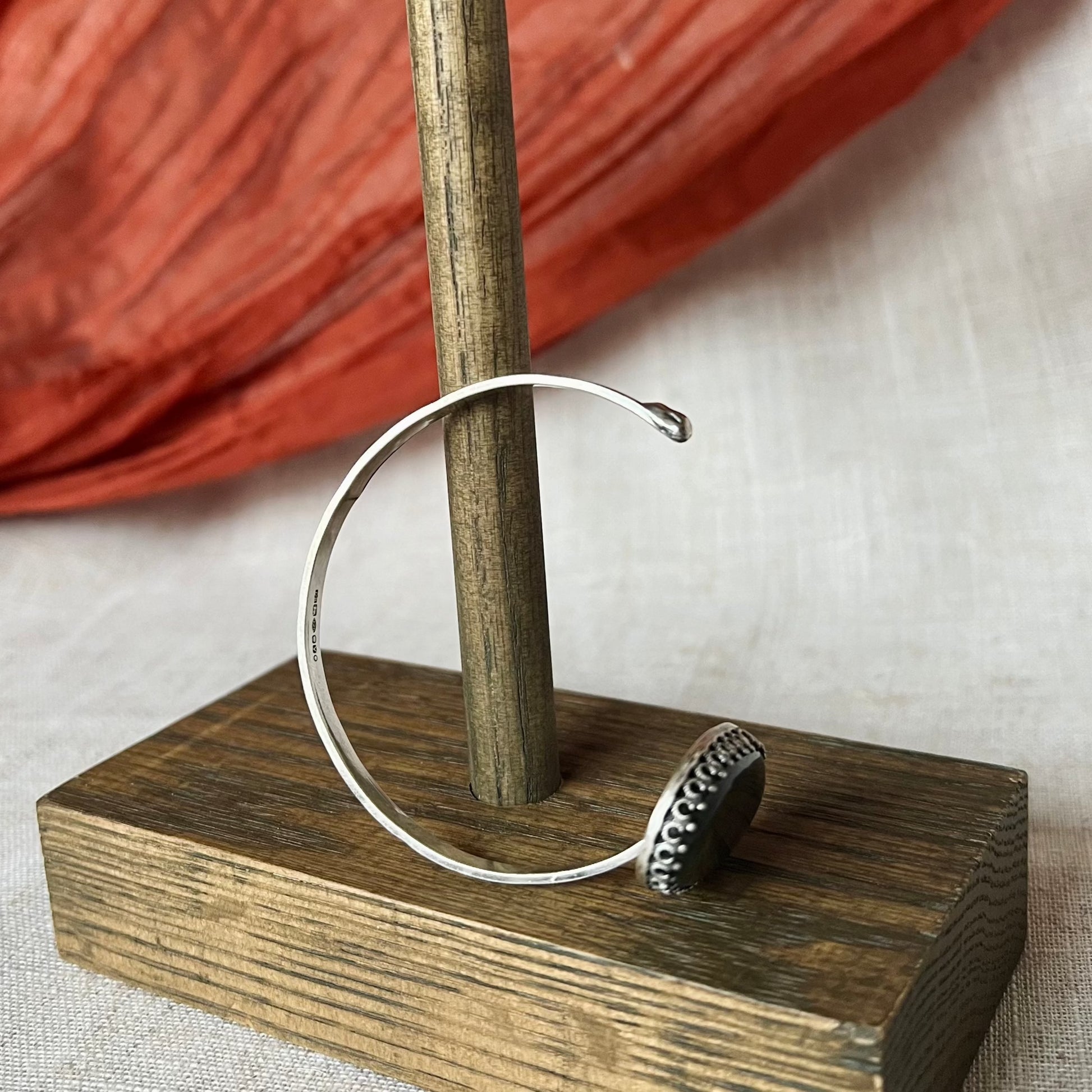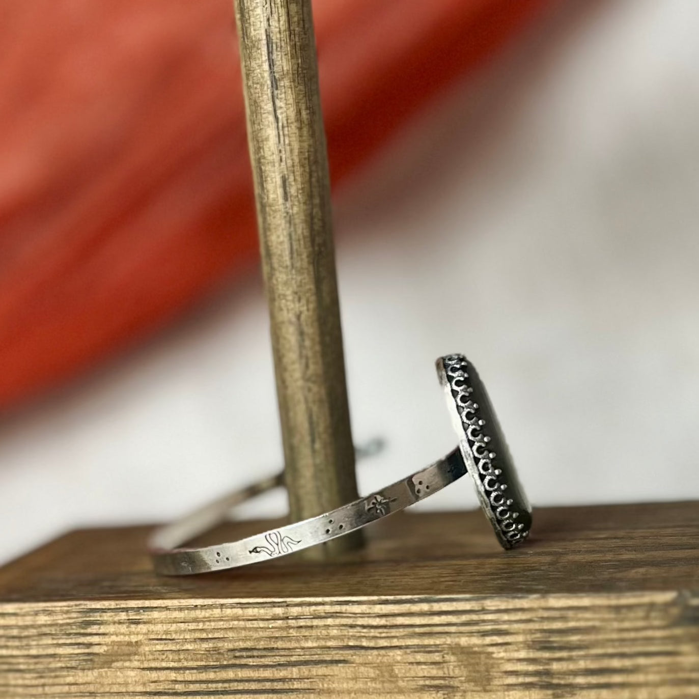 The bracelet can be easily adjusted by gently squeezing the ends together when wearing. Without adjustment the bracelet is about 5.7 cm at the widest point and the Turquoise stone is a whooping 19.4 x 31 mm on a slimline 4 mm recycled sterling silver band. The bracelet has a smooth band with star and snake motifs.