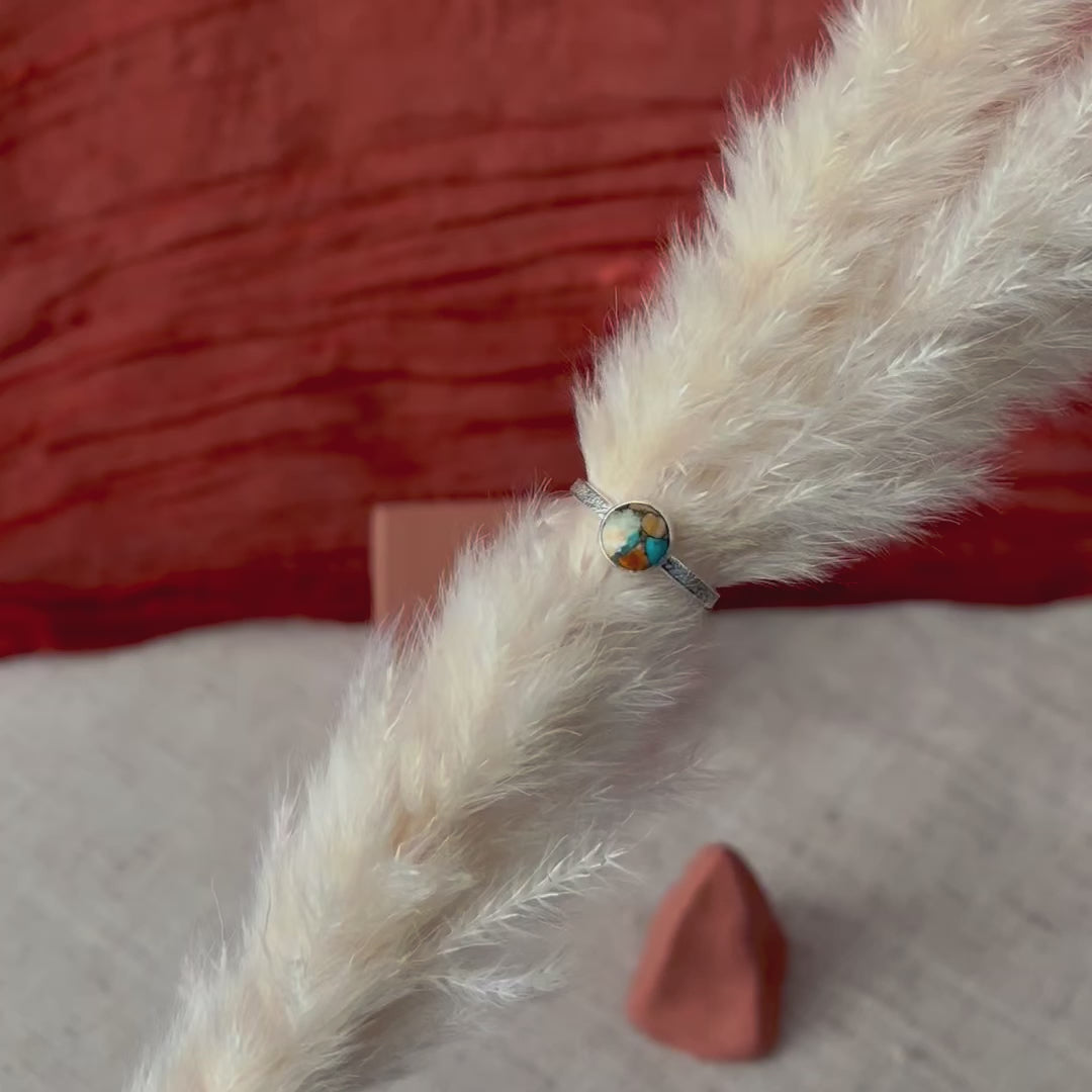 This beautiful Mohave Copper Turquoise is set on a recycled sterling silver textured shank. She is perfect on her own or stacked with others. The silver really makes the colours of this gorgeous stone pop!