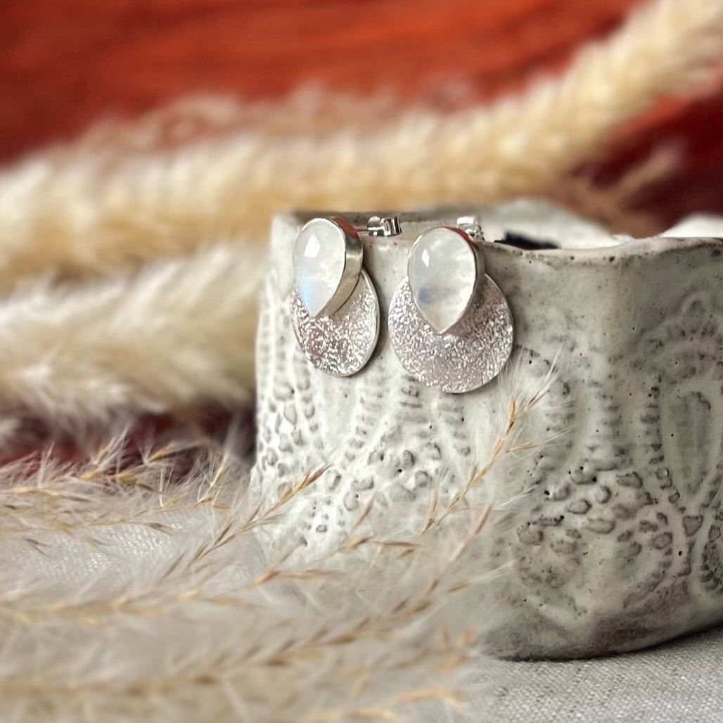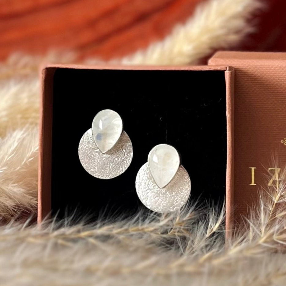 These Recycled Sterling Silver Moonstone Stud Earrings by IZABO feature stunning, large Moonstones set on a textured circle disc. Handmade from scratch, each piece showcases the ethereal glow of the moonstone, beautifully contrasted by the organic texture of the recycled sterling silver.