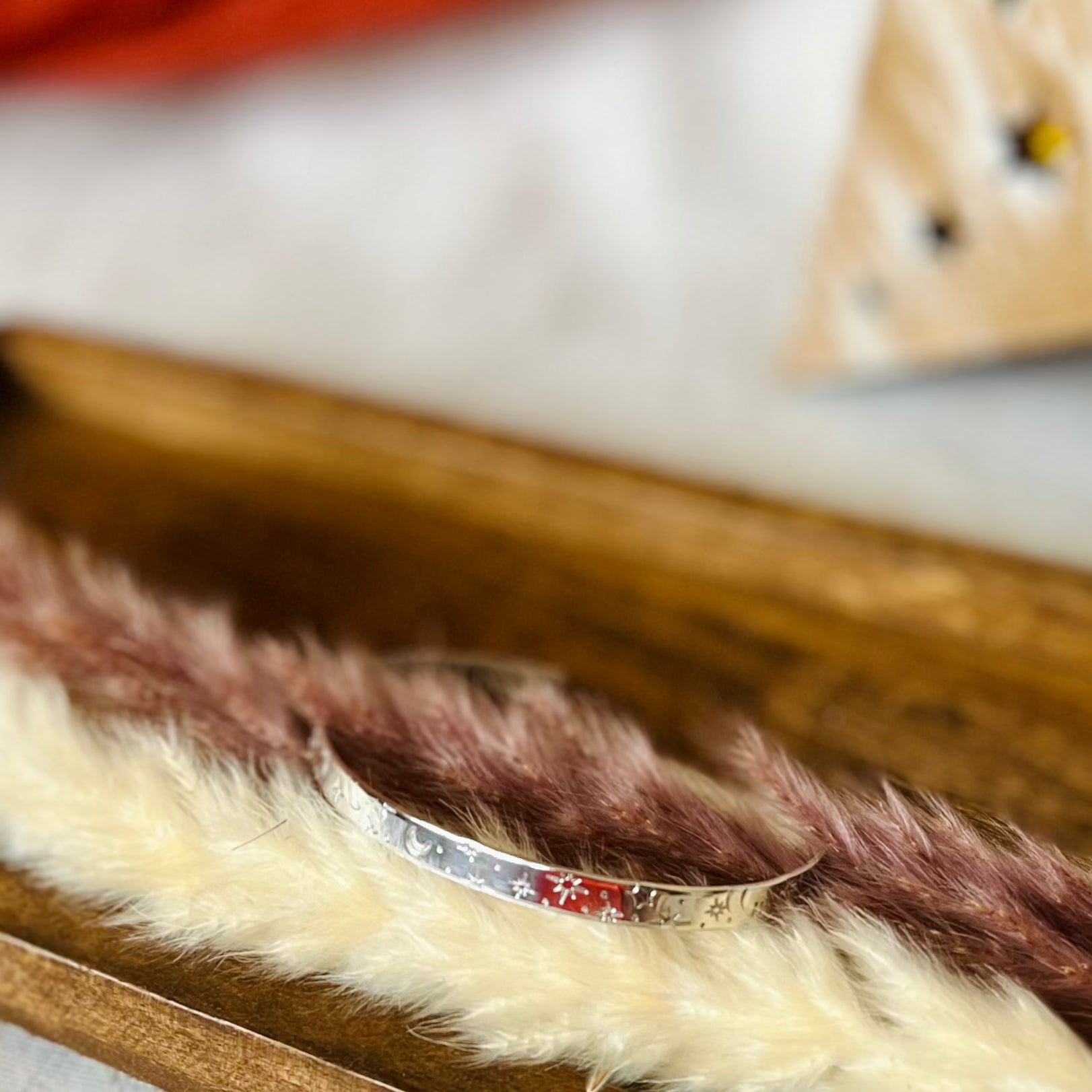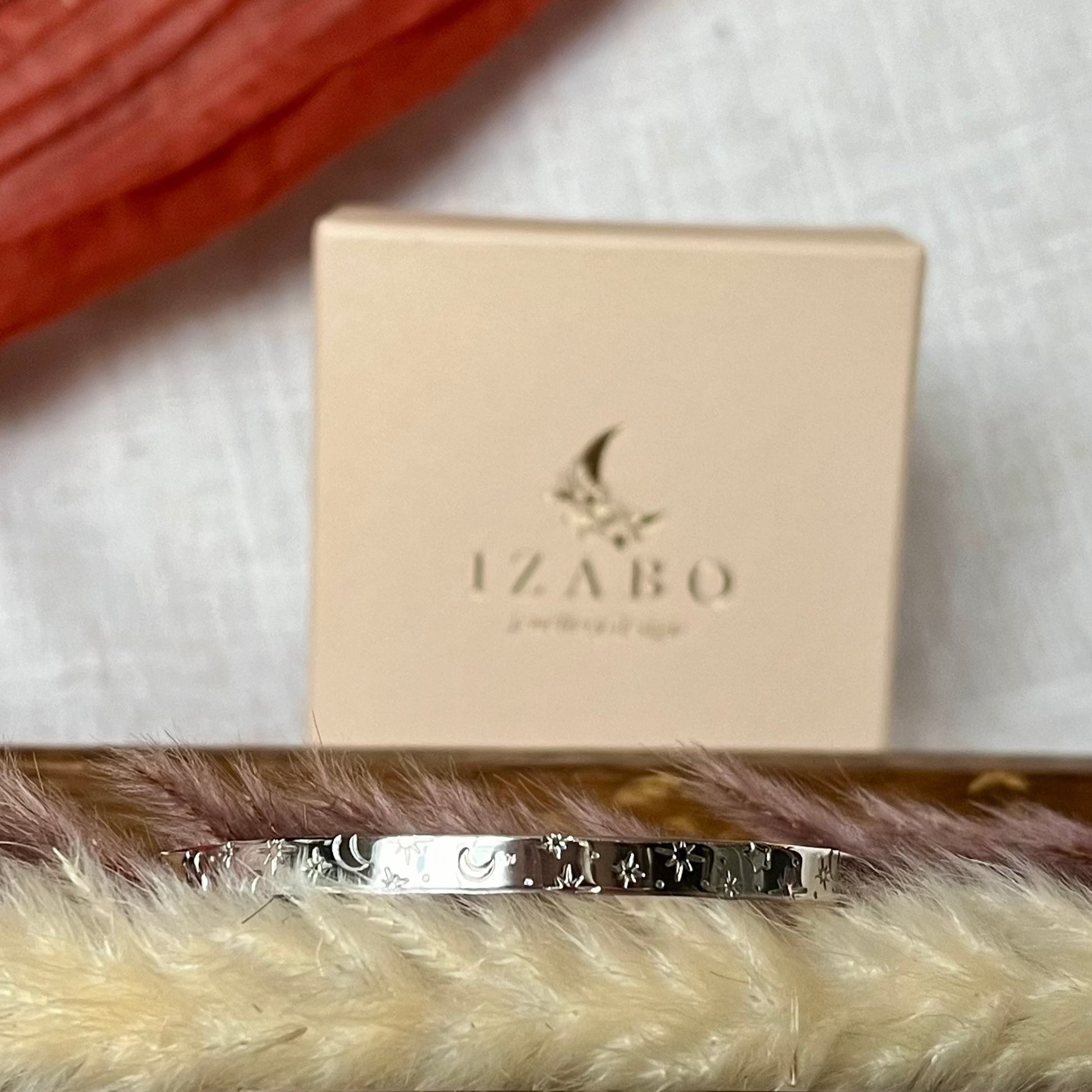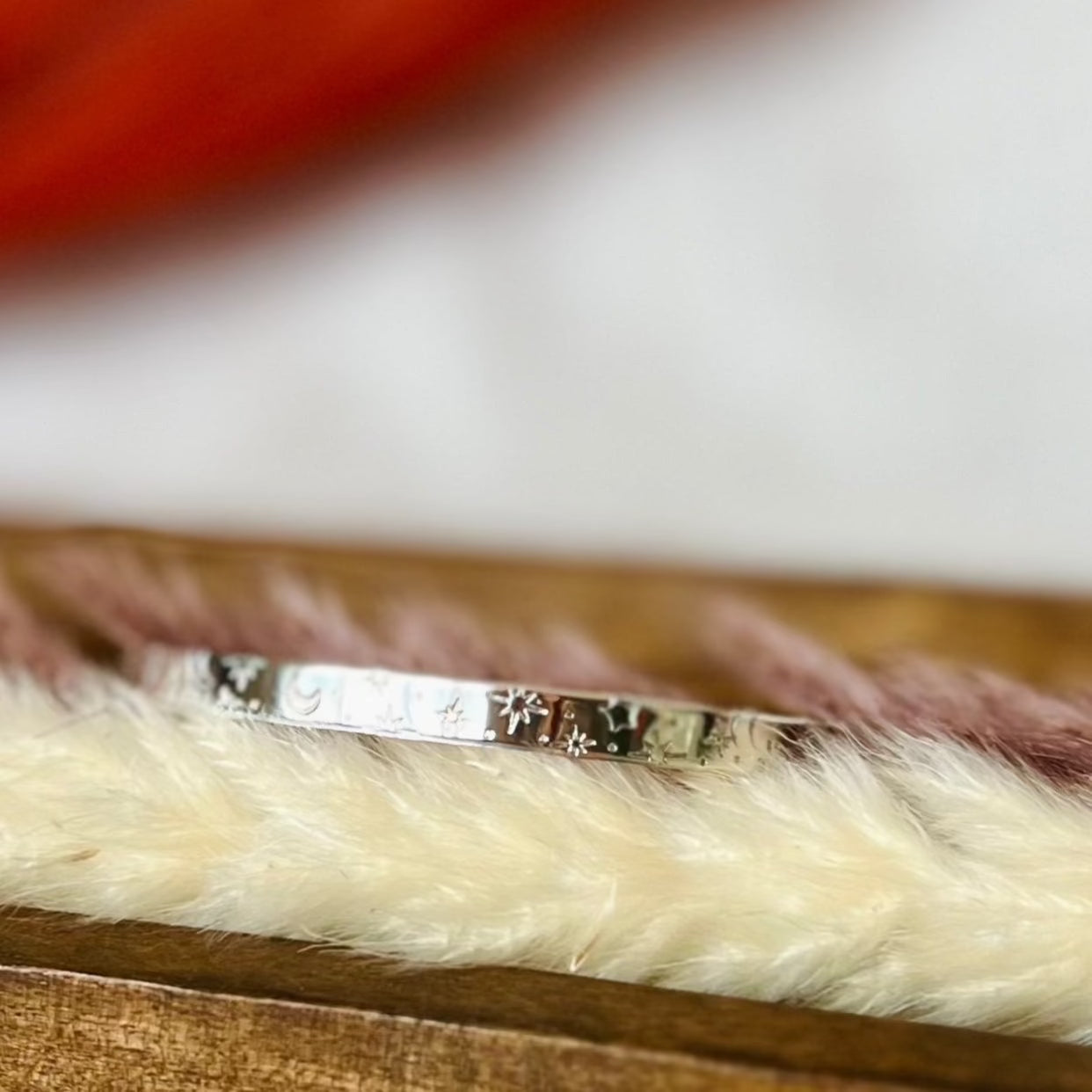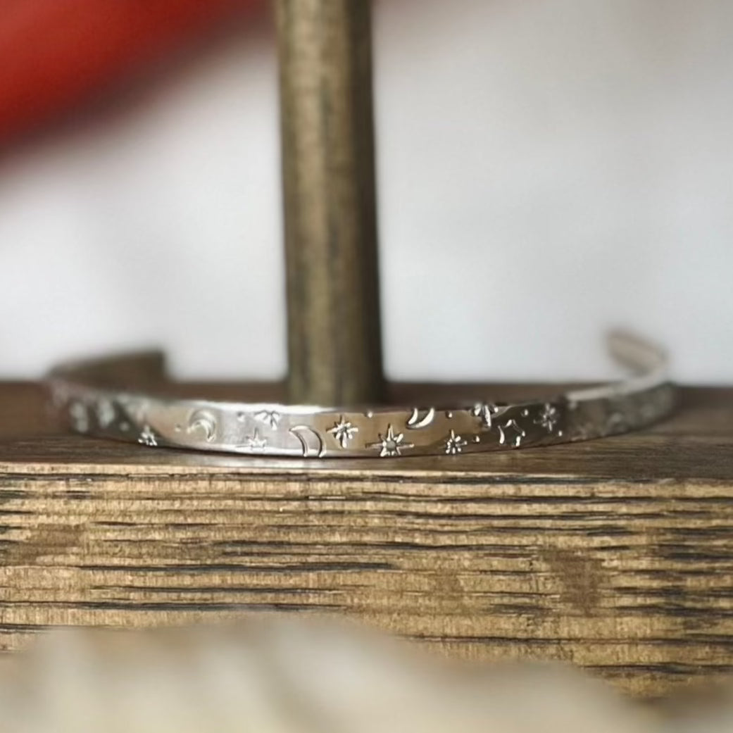 This bracelet can be easily adjusted by gently squeezing the ends together when wearing. Without adjustment the bracelet is about 6.5 cm at the widest point and the recycled sterling silver band is 5 mm wide. The bracelet has a smooth, high shine surface with celestial star and moon motifs.