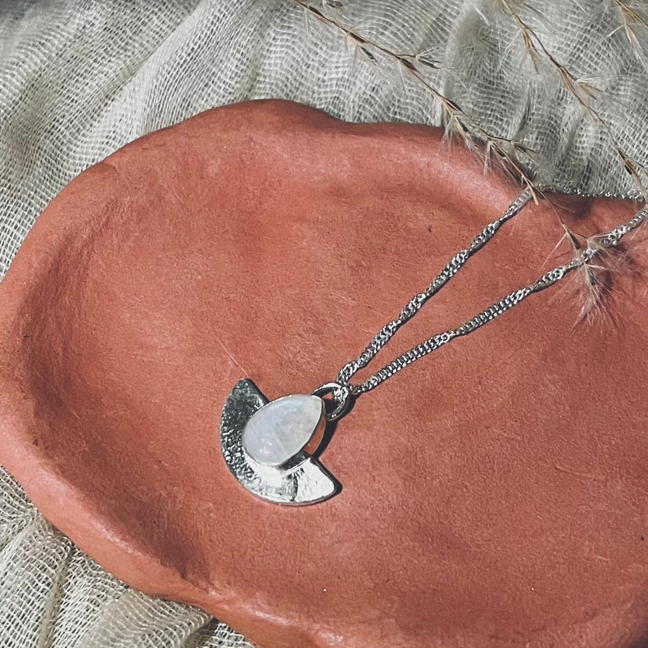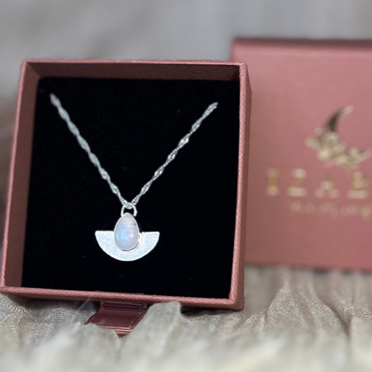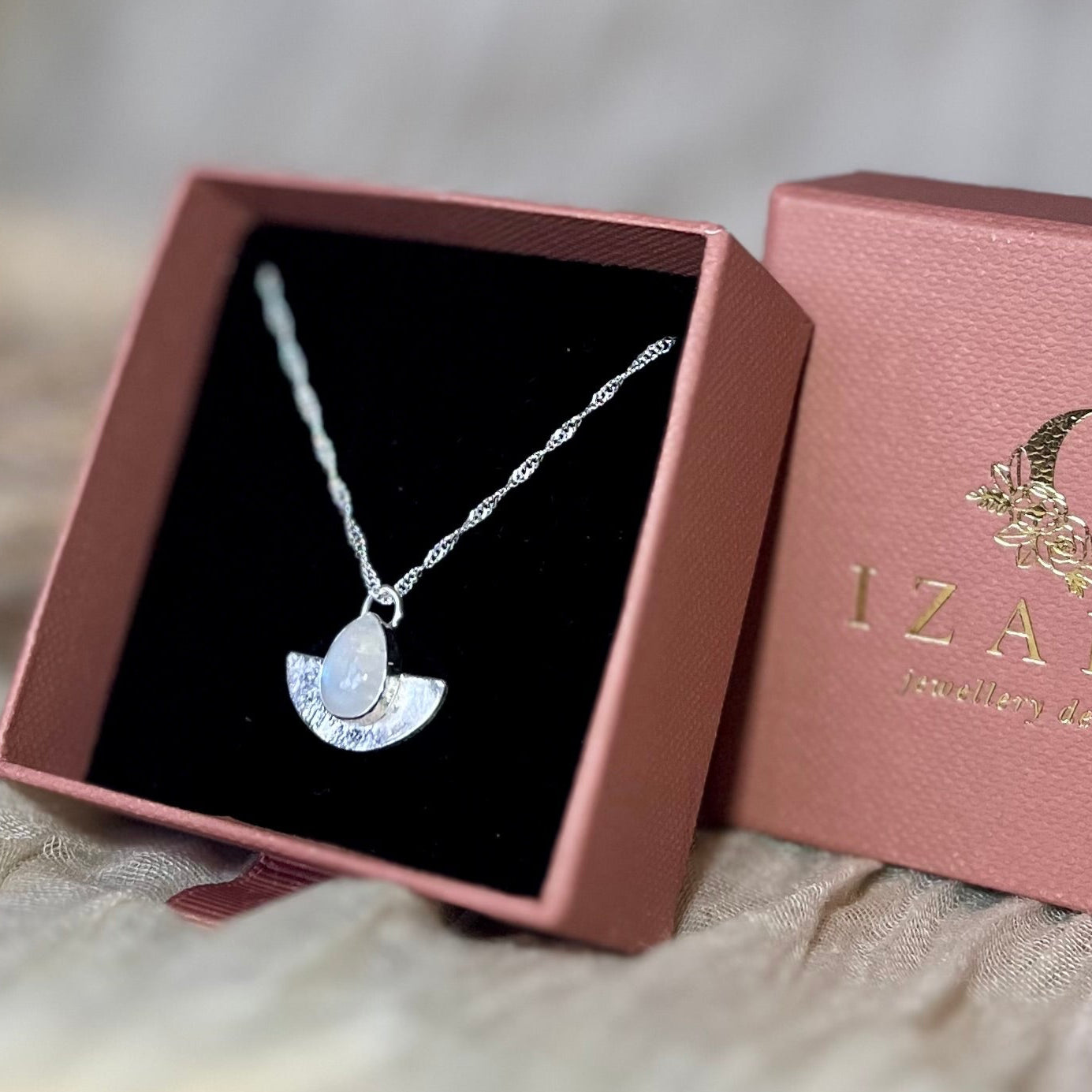 This beautiful rainbow moonstone necklace features a stunning 2 cm pendant, crafted by hand from recycled sterling silver.
