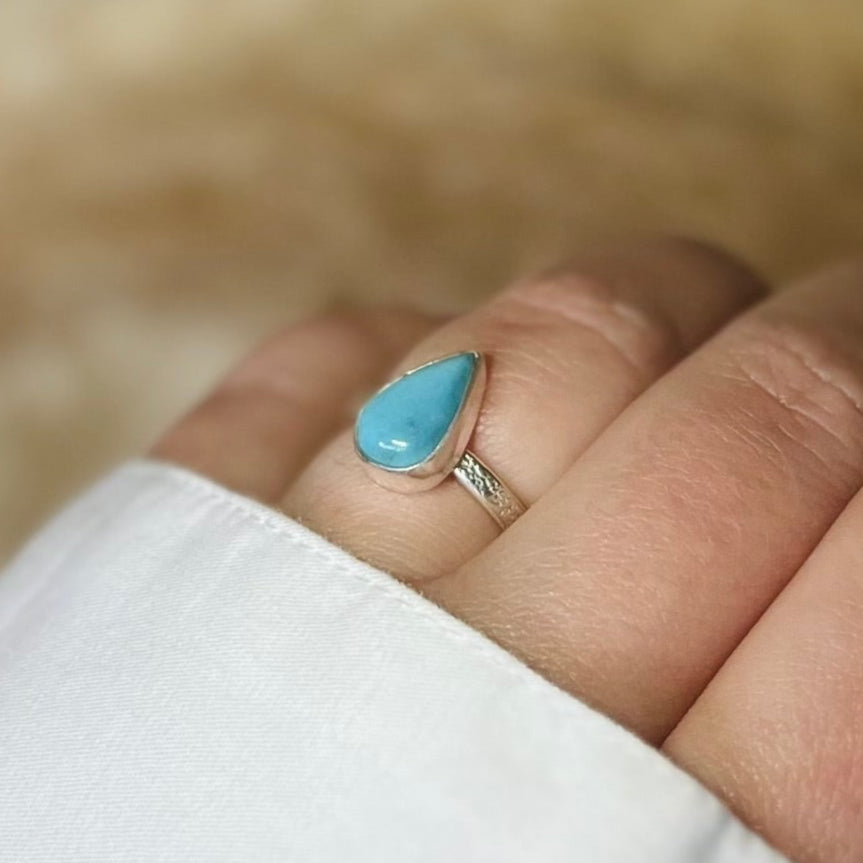 This size S Turquoise ring features a striking teardrop shaped stone set on a beautifully textured sterling silver band.