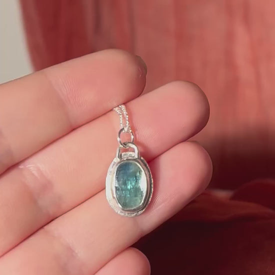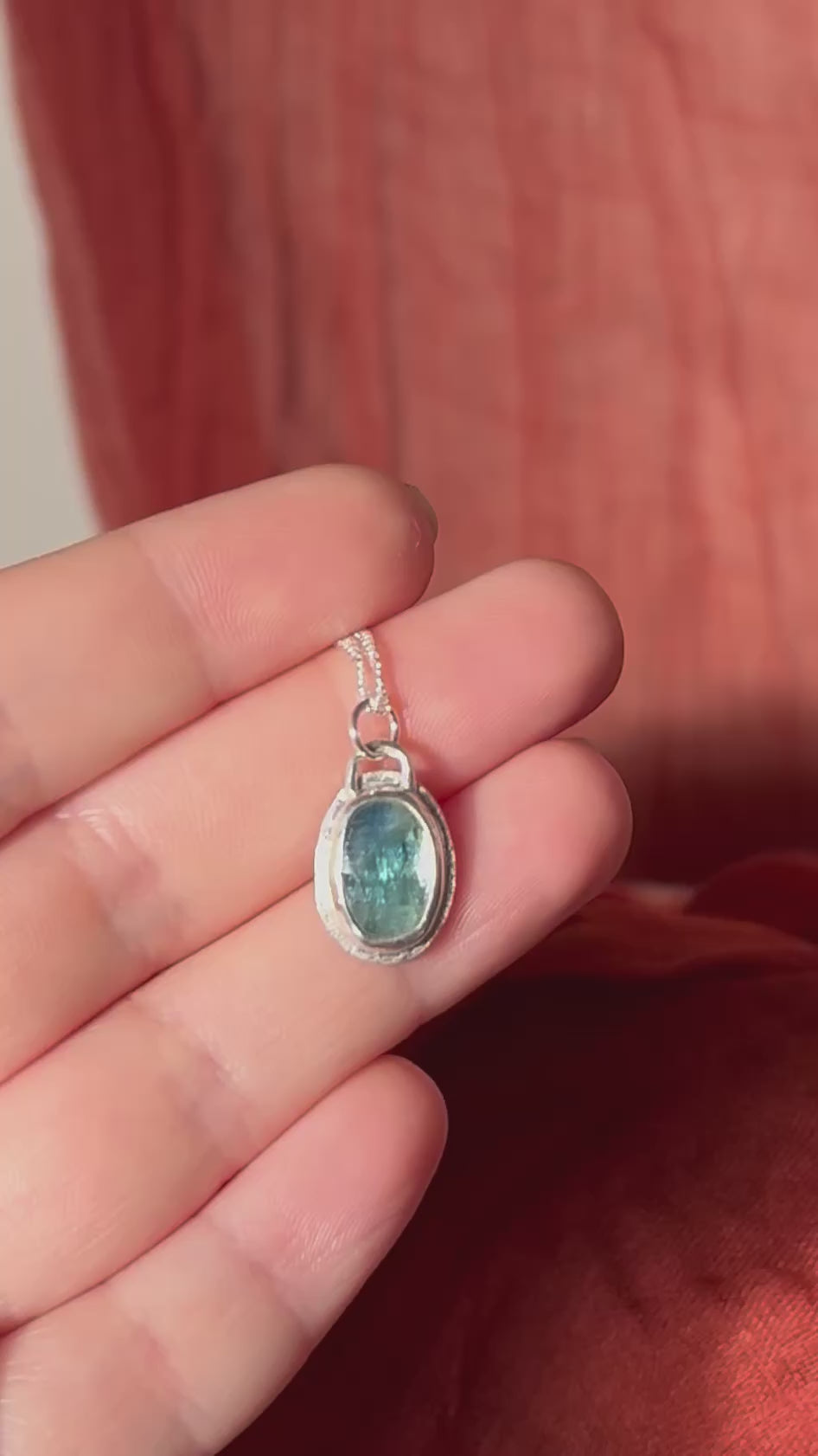 A striking Green-blue Kyanite gemstone set on a delicate twisted curb Sterling Silver chain, showcasing the stone’s natural striations and reflective shimmer. Its rich, layered hues catch the light beautifully, creating a subtle, mesmerising sparkle.