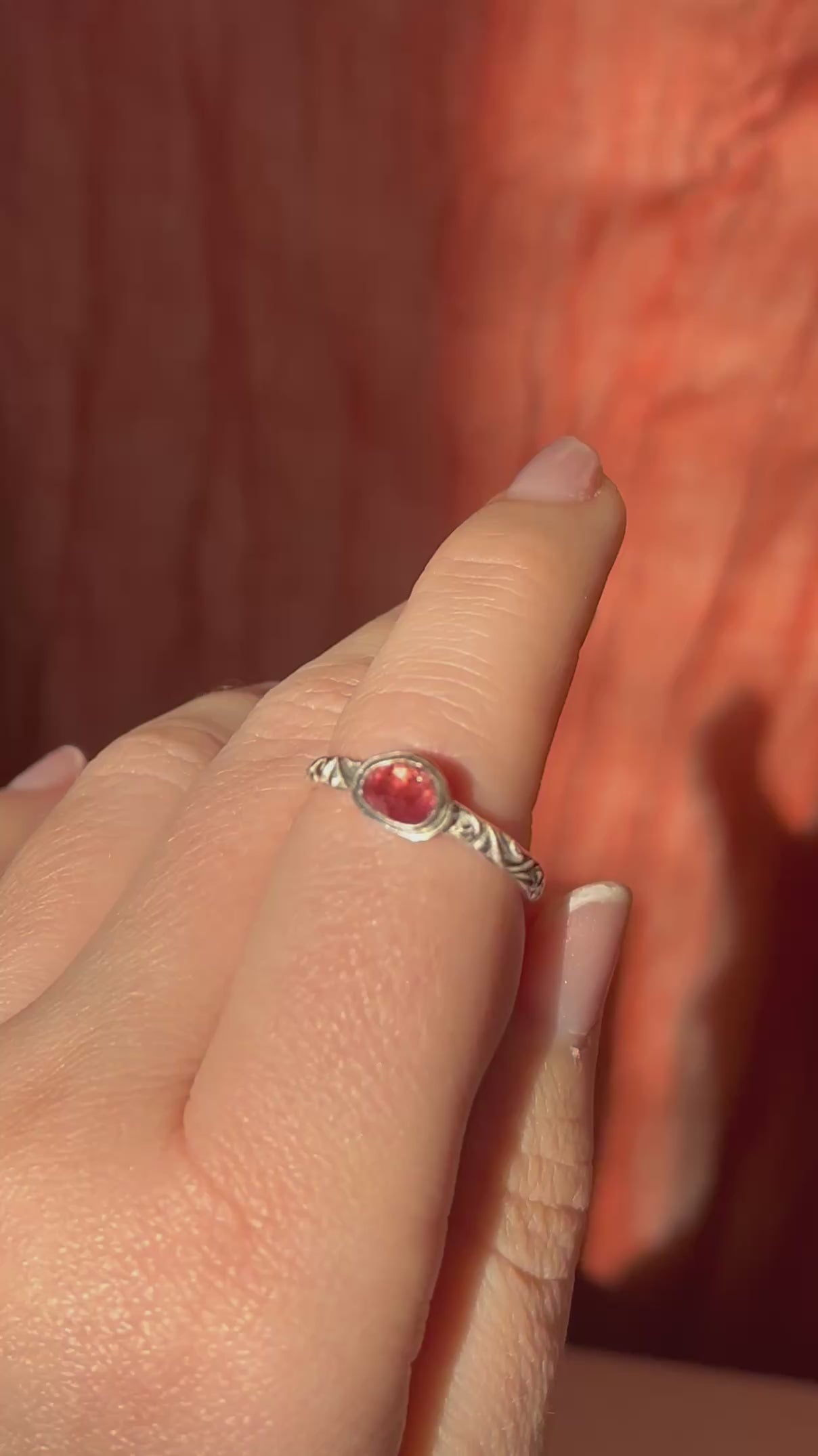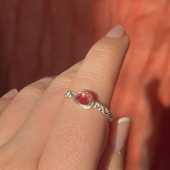 This Sterling Silver Stacking Ring features a delicate Pink Tourmaline set on a beautifully textured band — perfect for layering or wearing solo for a touch of warm, rosy colour.