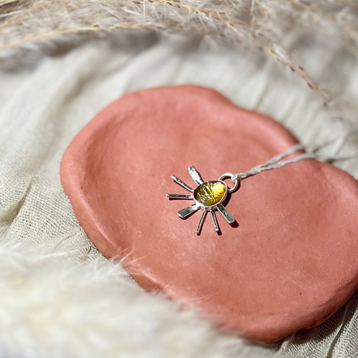 This gorgeous silver pendant features a vibrant yellow citrine stone, expertly crafted into a sun shape.